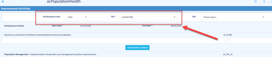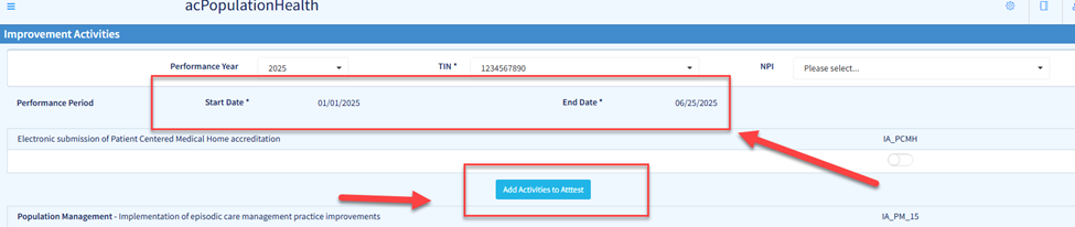 Select the Performance Period Start Date and End Date, and Click "Add Activities to Attest"
