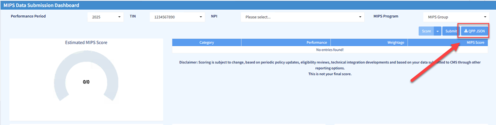 This will submit all the data for those categories to CMS. It is advisable that you download the QPP JSON file after submitting. To do this, click the "QPP JSON" button on the right of the submission dashboard.