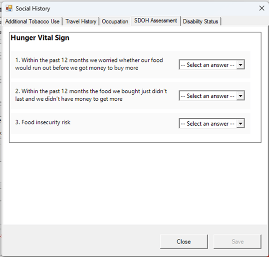 - Click the SDOH Assessment Tab to access the Hunger Vital Sign Assessment.