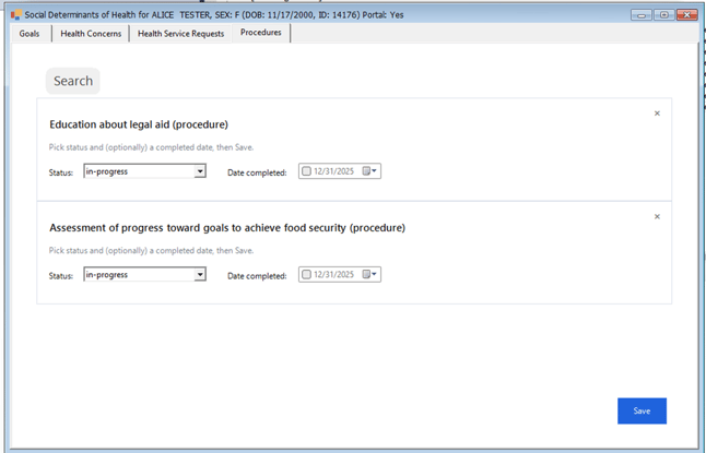 This enhancement supports USCDI V3 compliance by enabling clinicians to document SDOH-related procedures (interventions) in a structured way for interoperability and regulatory requirements.