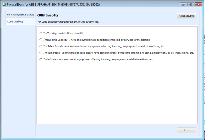 This tab is specifically designed for capturing disability-related information using the CUBS framework. - Document CUBS Disability Status